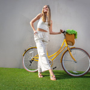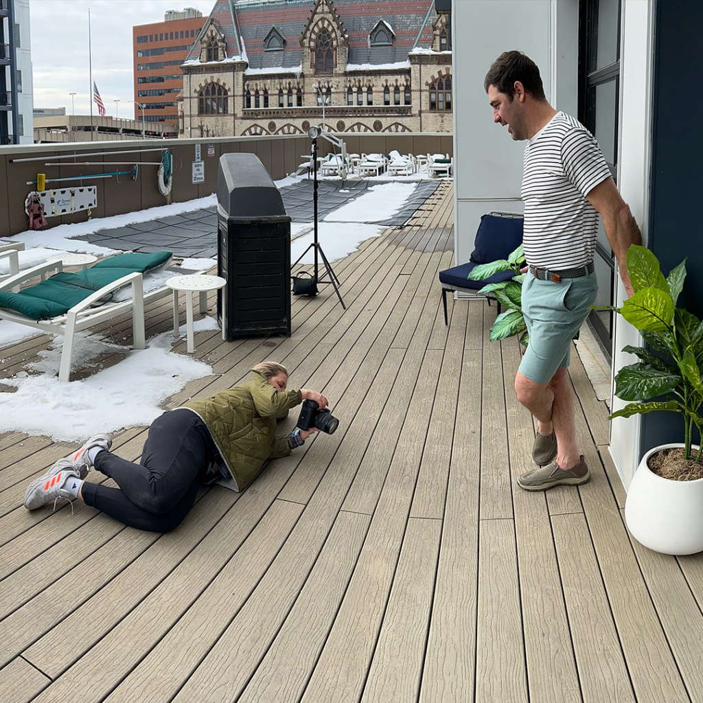 We photographed in some surprising spots that totally delivered: a parking garage, the vibrant second-story turf balcony at Post House apartments, and the cozy, plant-filled interior of Copper House restaurant. These backdrops gave us everything we needed—greenery, light, texture, and that touch of freshness that screams spring.